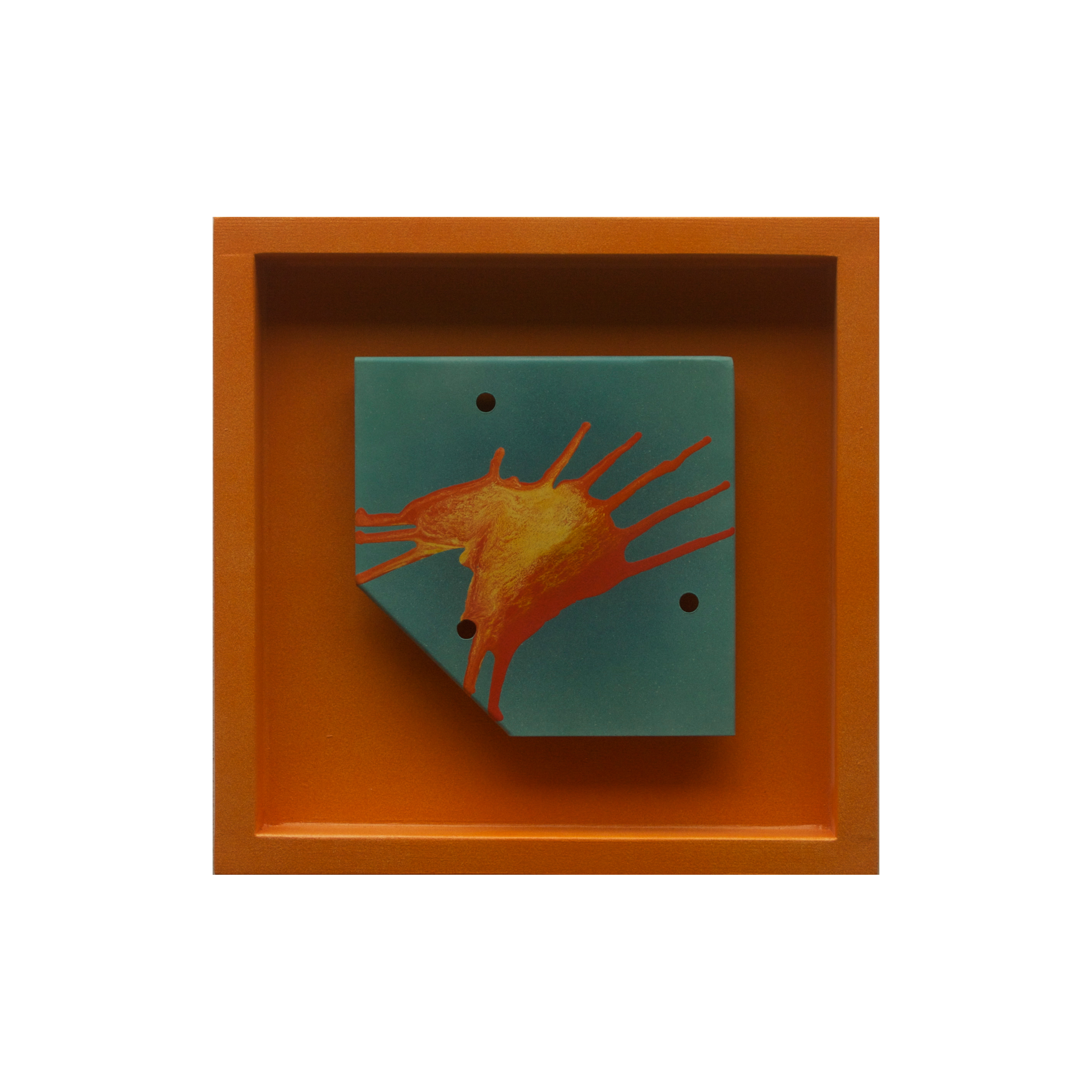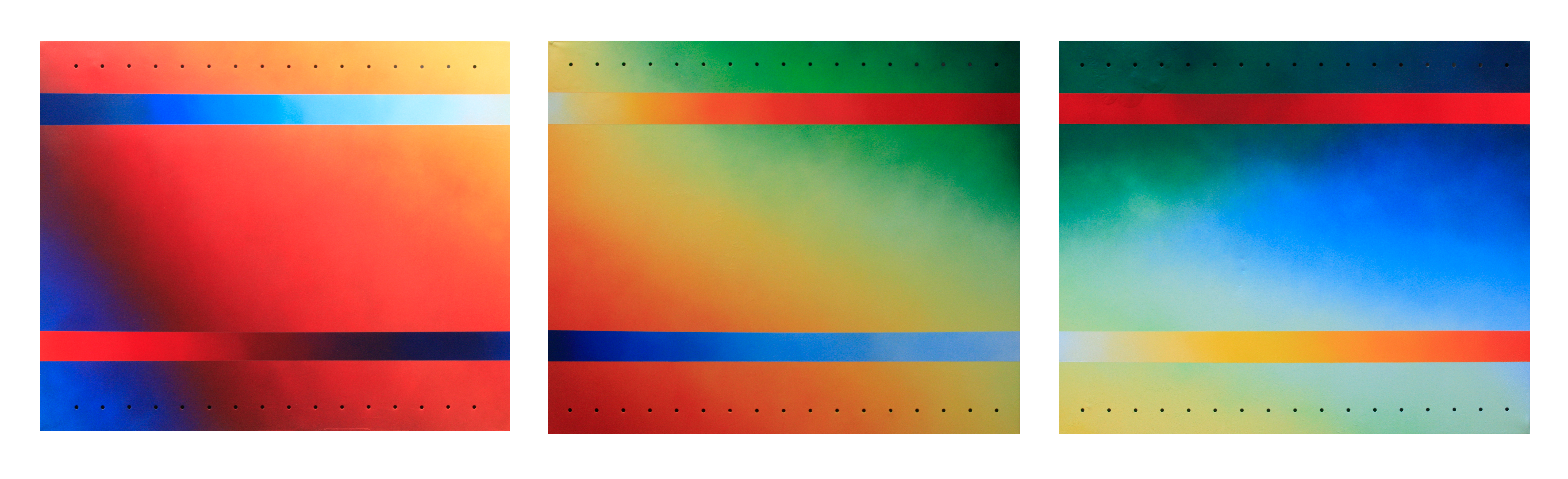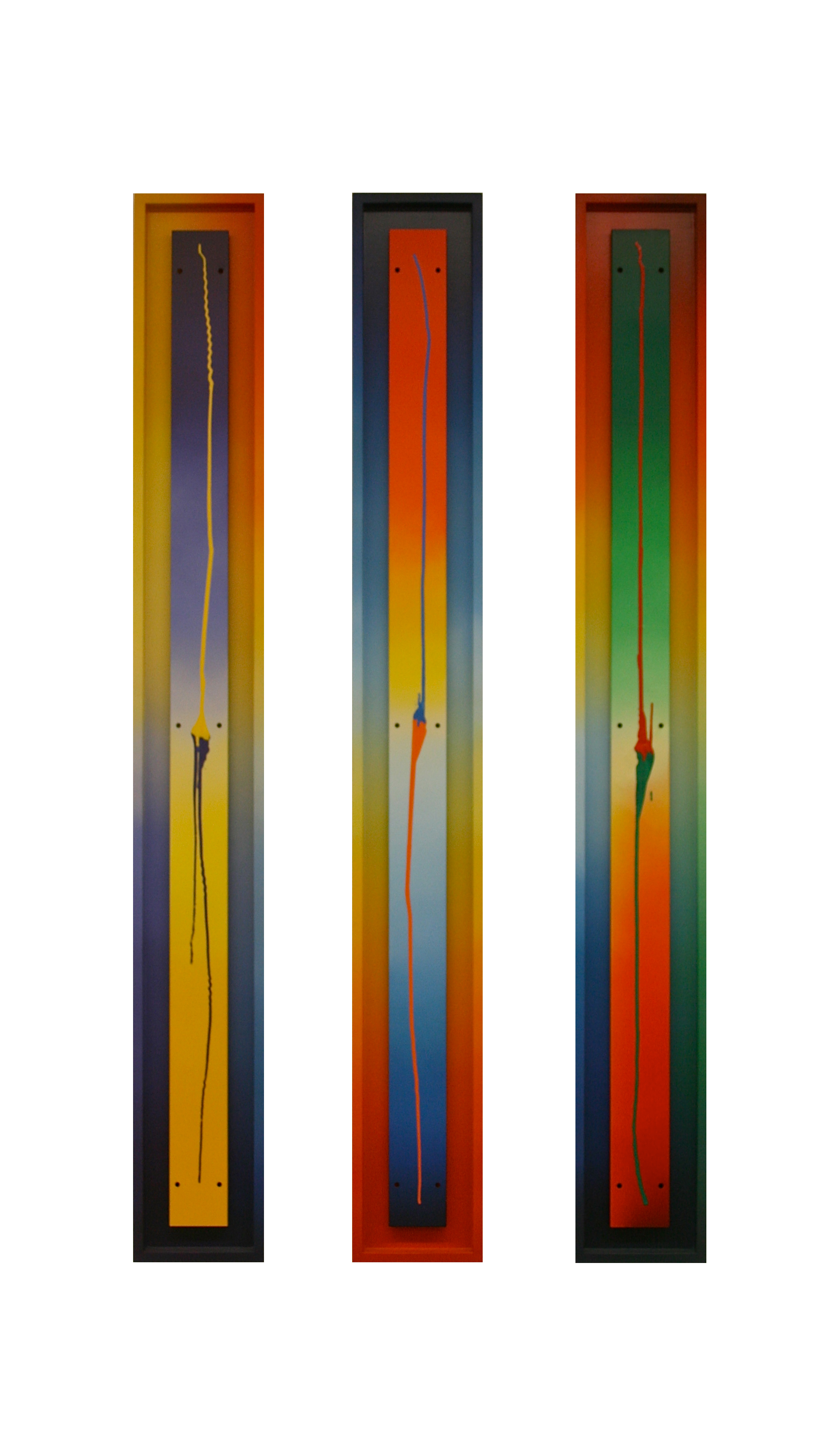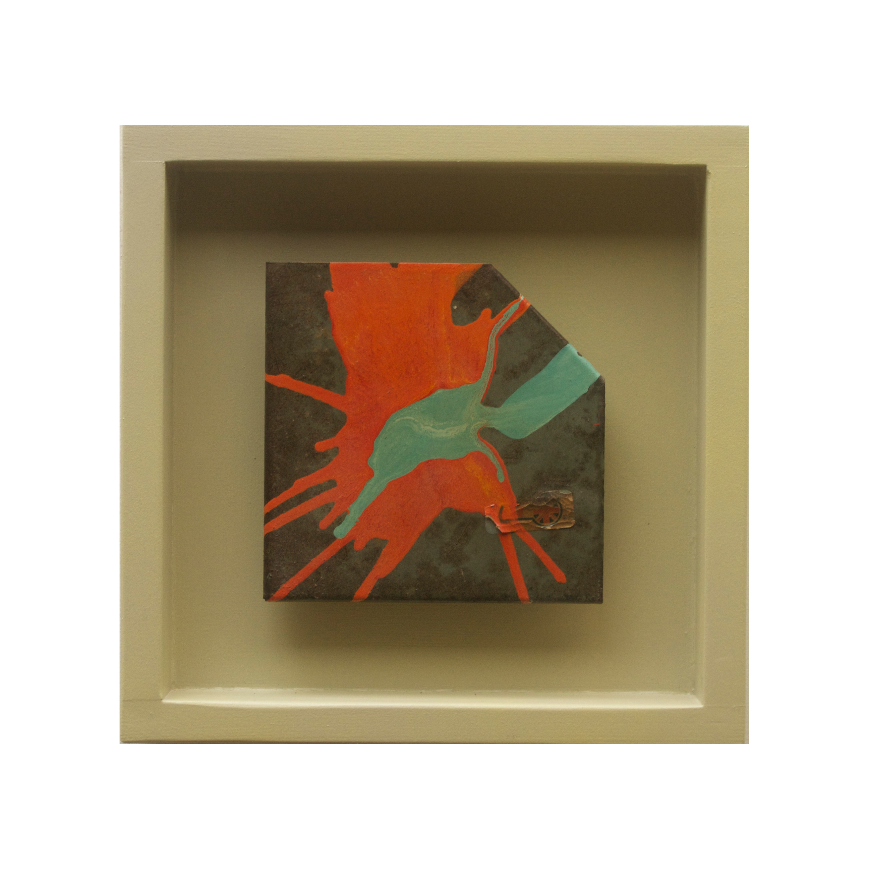 The conduit covers were once functional, the passing of time lead to their obsoletion, in contrast to the panel the paint had been sitting in liquid form full of blind potential, waiting for it’s make mark to be made. These paintings are all about the experience of these two completely unrelated materials when they unsuspectingly collided . The marks created are the result of the paint reacting with the metal with the minimum of control of those involved. Together the conduit, having served its intended purpose and the paint, now having lost its potential, both obsolete sit frozen, the moment when the liquid colour hit the hard metal surface, for the moment they are art.